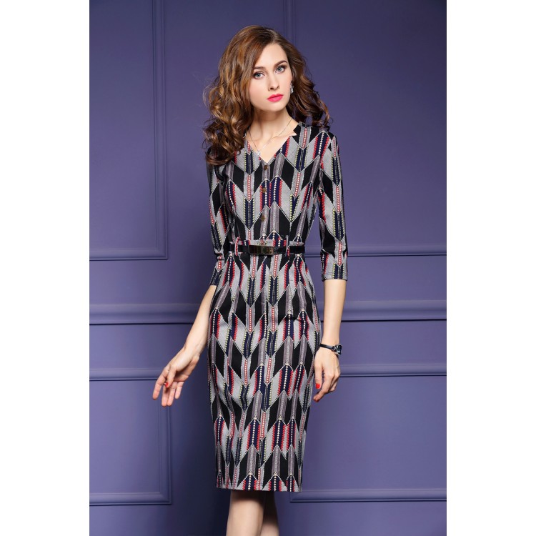 TE6676VIP Abito aderente aderente sul fianco, nuovo stile autunnale con scollo a V e stampa geometrica